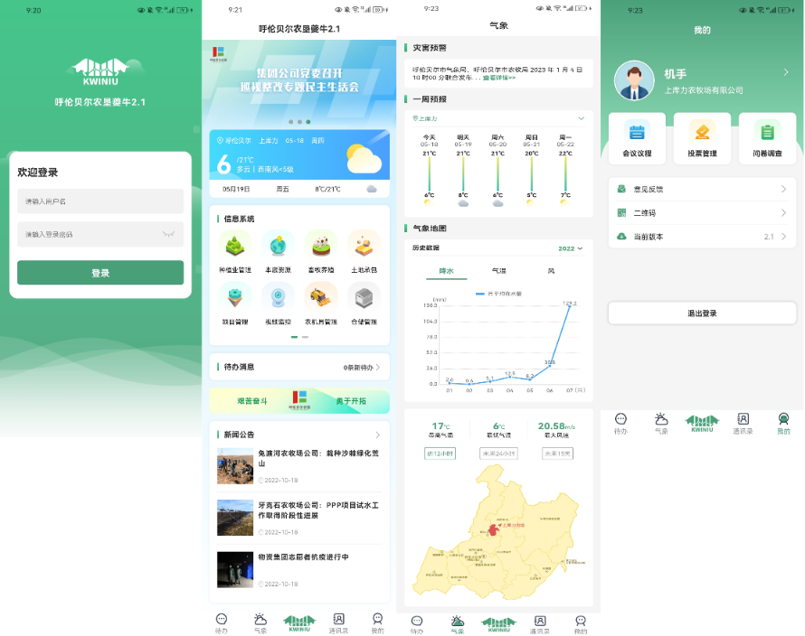 夔牛APP主要包括好球体育(中国)、待办、农情、通讯录、我的等5大导航菜单。其中,好球体育(中国)模块包含当天及次日天气预报、信息系统、待办消息、好球体育公告等功能,信息系统版块整合了种植业管理、本底资源、畜牧养殖、土地承包、项目管理、视频监控、农机具管理等子应用;待办模块包含了会议议程、投票管理、问卷调查等功能;气象模块包含灾害信息、一周天气预报、气象地图等功能;通讯录模块实现内部通讯录功能;我的模块包含用户信息,会议议程、投票管理、问卷调查等功能的快捷入口,意见反馈、二维码、当前版本、修改密码、退出登录等功能。